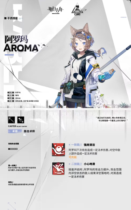 那么以上就是关于明日方舟新干员阿罗玛怎么样的全部内容了,不知道小伙伴们觉得这个新干员怎么样呢?新干员将会在新活动巴别塔中上线,小伙伴们赶快把合成玉攒起来了吧!