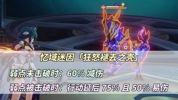 忆域迷因「狂怒褪去之壳」,需要削韧!58万生命值,且弱点未被击破时60%减伤,击破后延后75%且50%易伤。第1、2波各有一只,还想无视弱点力大砖飞,那对输出强度的要求就很高了。