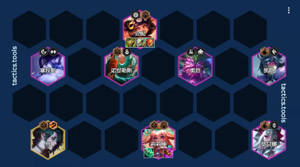 1、阵容组成:安妮、莉莉娅、凯隐、莫甘娜、泰坦、奥恩、塞拉斯/加里奥/辛德拉/艾希、慧