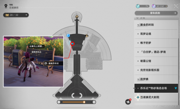 1、传送至“苏乐达热砂海选会场”,“巡猎之蕾”拟造花萼,在下图点位找到椅子上的“健美苏乐达”,与他对话;