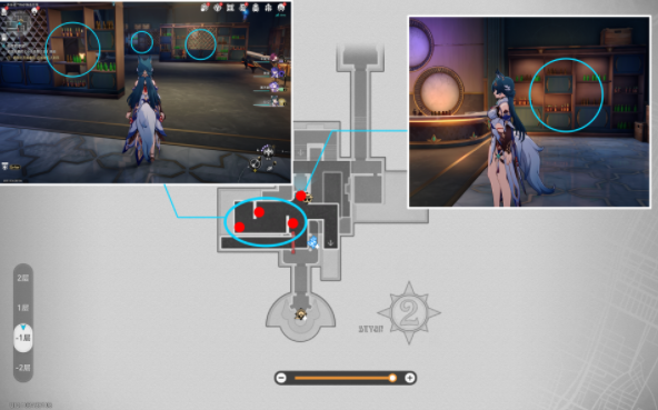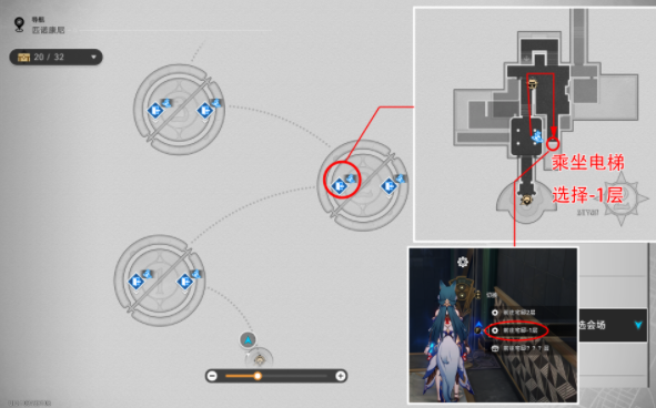 1、传送至“苏乐达热砂海选会场”,“枪火时间·枪火的试炼”锚点,按如下图所示路线乘坐电梯至-1层;