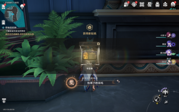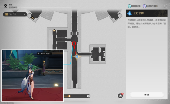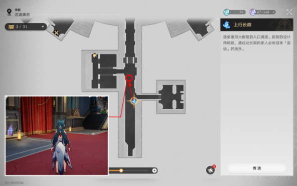 1、传送至“匹诺康尼大剧院”,“上行长廊”锚点,传送后往北走,到如图标识位置,会自动收到来自知更鸟的短信(判定区域应该比较大,如果没接到就在附近走走);