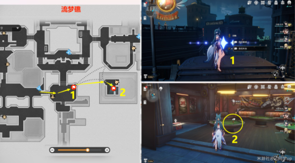 1、玩家要从【流梦礁】下图1位置,坐车【前往天台】2位置: