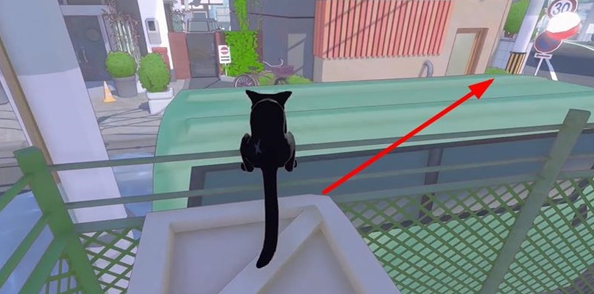 3、然后往右侧看,借助周围的建筑物来跳到这个绿色的车顶上,然后站在车顶;