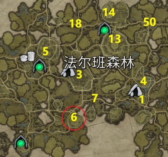 该boss在法尔班森林南部两个墓地之间游荡,这个boss是会移动的,玩家可以来到下图红圈6的位置来寻找。