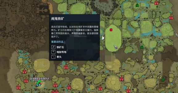 游戏中最佳获取地点是地图中部的这个闹鬼铁矿。传送到地图中部的传送门左右都可以,然后沿着主路到达这个矿场的北部,这是唯一的入口,然后你往南走,这里面到处都是铁矿。
