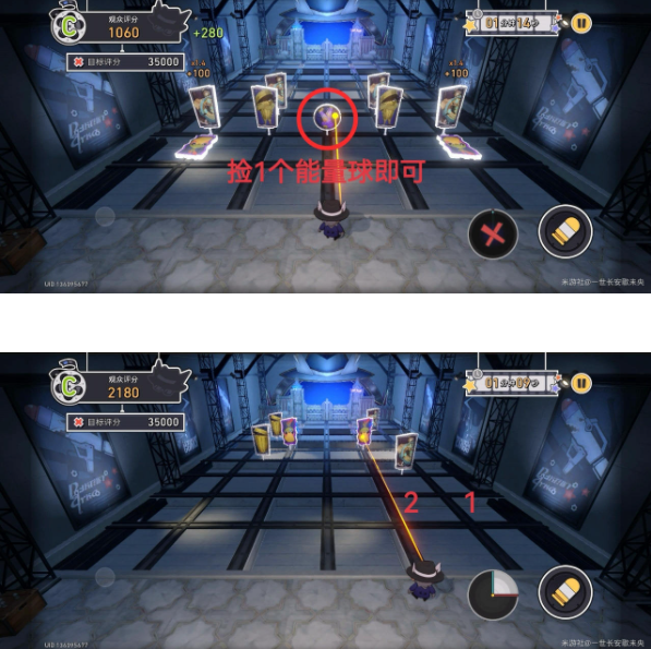 2、然后捡1个能量球,然后站在从右往左第2条线上(开局中间的牌倒下后会有一个球,之后也会出现球,但捡1个足矣);