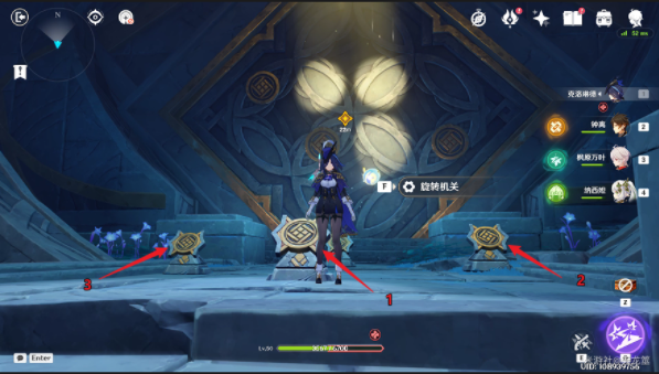 3、后面跟着指引往前走,等来到大门处后按图中顺序分别旋转一次机关,即可打开大门;