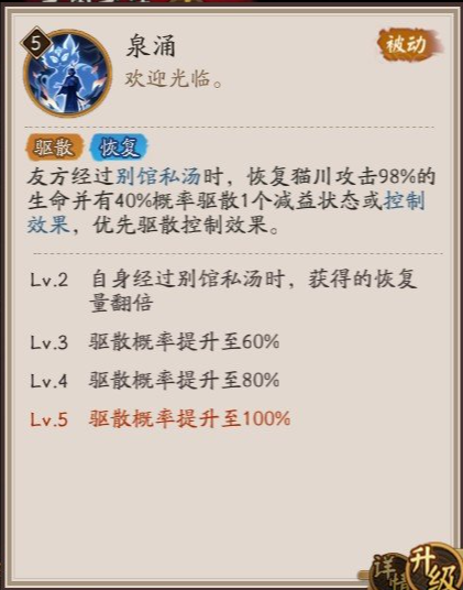 友方经过别馆私汤时,恢复猫川攻击98%的生命并有40%概率驱散1个减益状态或控制效果,优先驱散控制效果。