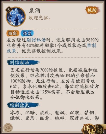 固定在行动条70%的位置,免疫减益和控制效果,继承猫川攻击550%的生命值和100%防御,无法行动。友方每使用普攻6次,泉水化猫攻击6次,每次对随机敌方目标造成攻击125%伤害,不会触发敌方全体御魂效果。