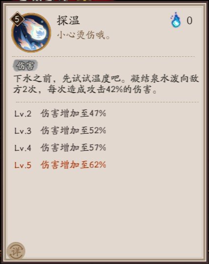 下水之前,先试试温度吧。凝结泉水泼向敌方2次,每次造成攻击42%的伤害。