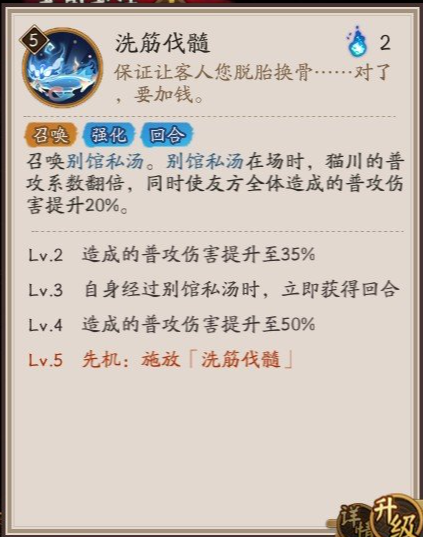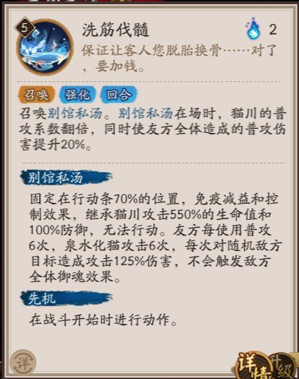 召唤别馆私汤。别馆私汤在场时,猫川的普攻系数翻倍,同时使友方全体造成的普攻伤害提升20%。