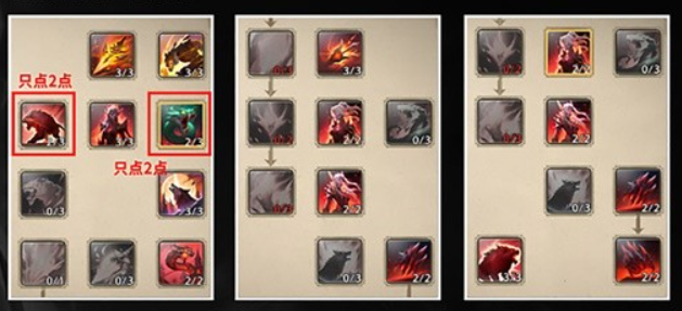 对单BOSS战/前期开荒可考虑点满“野性终结”,怪物低血量时伤害比宝宝还高。对群场景可考虑点满“猛兽横扫”。(前两排的天赋,或者最后一排的“狂野精神“可以自行选择舍弃)不太推荐点“胡蜂射击”,因为胡蜂射击需要叠3次才能输出最大化,转火能力较差。并且在恢复联携值方面也不如“蝮蛇射击”。