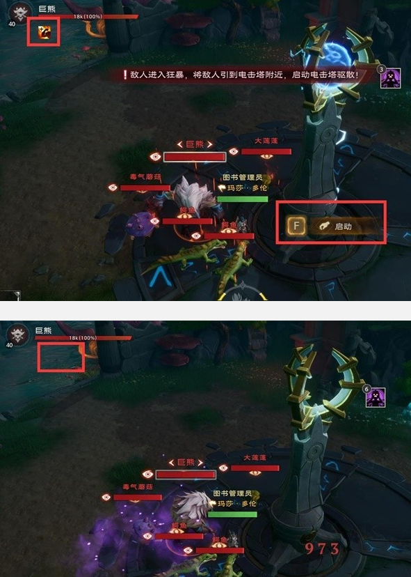 会使用恐惧咆哮,使自己陷入狂暴状态,可以将其引到电击塔旁边后,使用旁边的电击塔点击,使其解除狂暴。