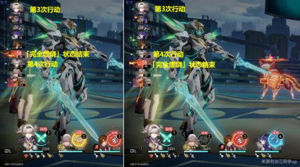 2、然后等流萤第3次行动时(第3次释放强化E技能时),再次先释放同协主的大招给流萤第2次增加一次速度后,就能将流萤第4次行动提前到「完全燃烧」状态结束前,这样利用同协主大招给流萤增加2次速度后,就能实现在「完全燃烧」状态结束前,流萤行动4次,释放4次【火萤Ⅳ型-死星过载】(强化E技能)了,正常不给流萤加速的情况下,流萤在「完全燃烧」状态结束前,只能释放3次【火萤Ⅳ型-死星过载】(强化E技能)