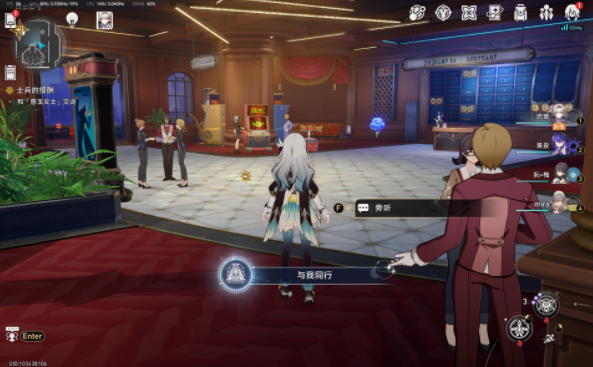 4、出现任务要求:(可选)在晖长石号上找到开拓者,此时,传送至「晖长石号」中的「主宴会舱」锚点,按照如下图所示路线,前往地图二层,于蓝点处自动触发对话;