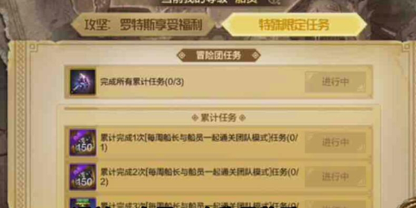 3、接着点击进入就可以查看到冒险团任务中的【完成所有累计任务0/3】。
