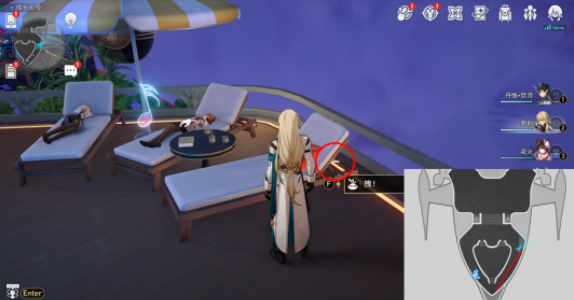 首先传送至晖长石号-舰昵部泳池传送点,在右手边方向有3个躺床,在第三个躺床上有一个折纸小鸟,需要拽一下。