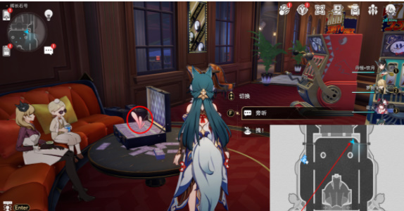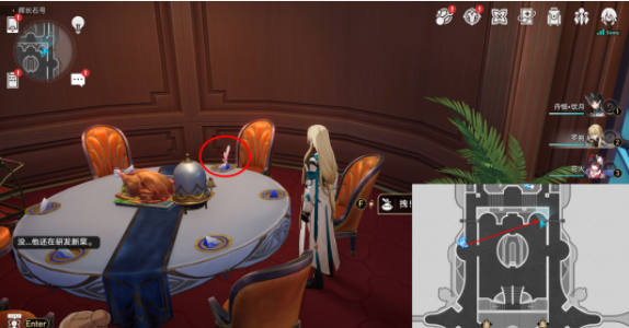 出宴会舱后上二楼,走右侧楼梯上,在桌子上的灯有一个折纸小鸟,需要拽一下。
