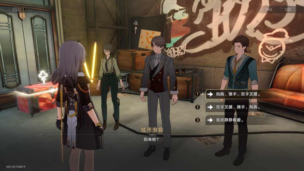 来到流梦礁下图位置,第一次过来会触发对话,然后和城市浪客对话学习暗号,再次对话依次选择“抱胸”、“摊开手”、“双手叉腰”