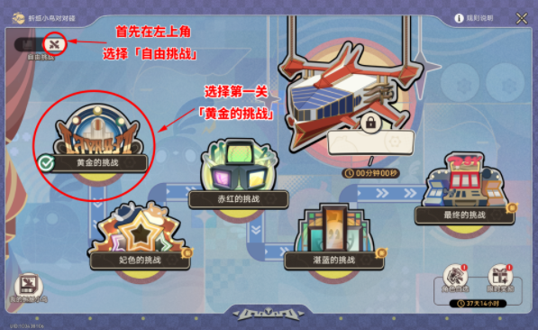1、首先在左上角选择模式「自由挑战」(需完成剧情),在此处选择第一关「黄金的挑战」;