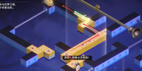 5、最后金色的齿轮路线如下图所示,玩家通过调整积木模块和幻梦之镜就能达到。