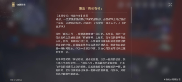 在崩坏世界的废墟中,晖长石号是一座神秘而庄严的铁道遗迹,据说隐藏着丰富的资源与宝藏。作为一名探险家,你的任务就是重返晖长石号,并收集宝贵的物资。现在,跟随我的引导,一起踏上这段刺激而危险的旅程吧!
