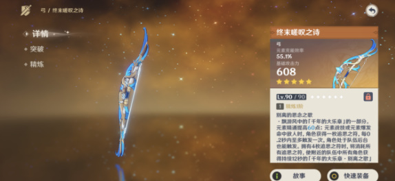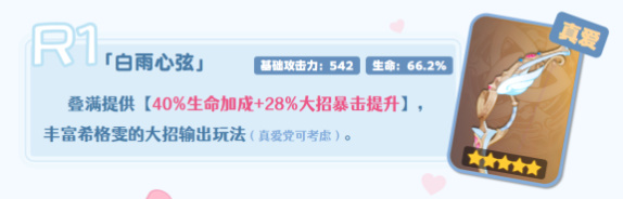 战技造成伤害后将概率刷新战技CD,可让希格雯“双E”产出足足8枚水元素微粒,后续如果搭配其他水元素角色能大大缓解其充能需求,是治疗辅助向希格雯的优选武器之—。