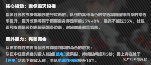 丽娜的连携、支援攻击、强化特殊技能提供6s左右的穿透率加成,刚好够打鲨鱼的连携+2段强化特殊技+终结技,丽娜优点是动作快、多种手段灵活上增益,但是穿透率没有叠超过50%的时候收益太低,且丽娜很吃自身穿透率面板。