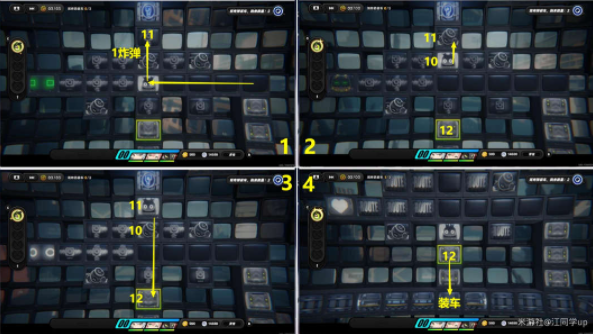 7、首先来到1炸弹下面,将1炸弹推到11区域后,继续往11区域走,就会自动将1炸弹换到下面10区域,最后再将1炸弹推到12区域完成装车即可;