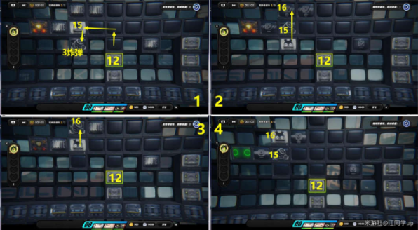 10、接着来到3炸弹上面,继续往3炸弹区域走,就会自动将3炸弹换到15区域,接着继续将3炸弹推到16区域后,继续往16区域走,就会自动将3炸弹再换回到15区域;