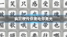 在《疯狂梗传》游戏中存在很多的关卡,本关“你是电你是光”需要玩家们全部找到图中的歌词,将它们连在一起,难度比较的大,相信还有很多的玩家没有顺利的通关,下面我们为大家带来一份详细的攻